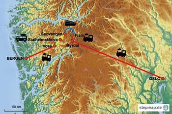 Diese einmalige Tagestour können Sie alternativ auch in Bergen beginnen und in umgekehrter Reihenfolge wieder in Bergen enden lassen bzw. dann bis Oslo fahren.
